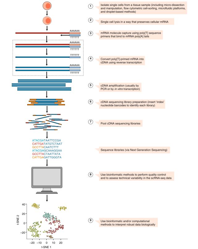 理論上說,任何的真核細胞都可以進行scRNA-seq檢測。但在實際操作過程中,需要注意的是:1)從組織(特別是實體組織)中獲得細胞的數(shù)量和活性;2) 在獲取過程中人為操作對細胞轉(zhuǎn)錄組的影響,以避免出現(xiàn)人為因素的轉(zhuǎn)錄表達變化。當(dāng)然從技術(shù)上說,除了分離單個細胞進行檢測外,還可以直接分離細胞核(nuclei)進行測序。